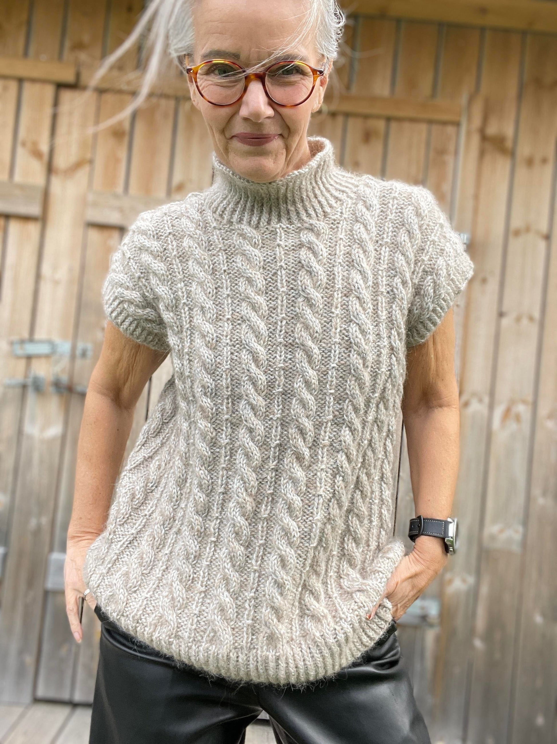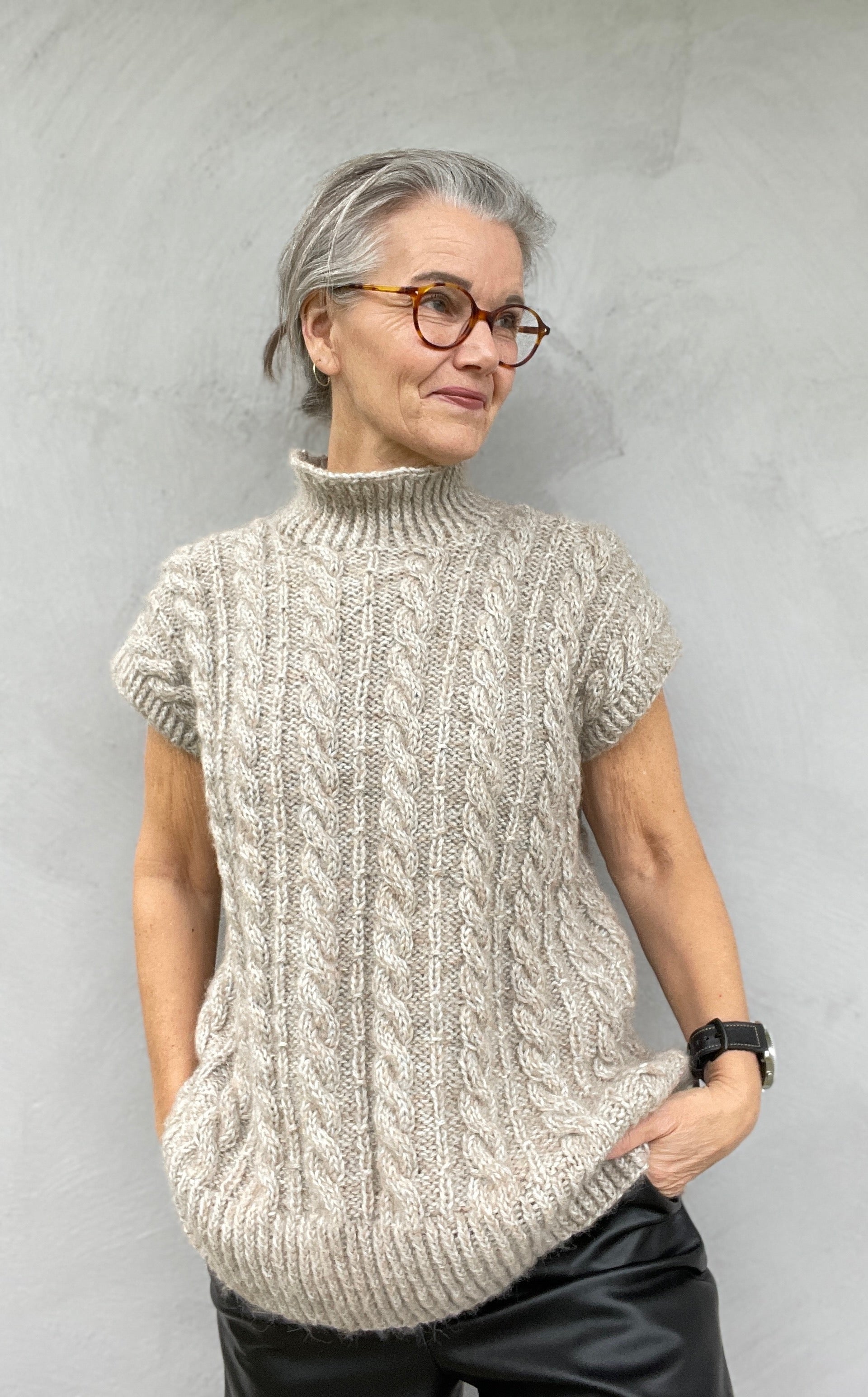 Flettestrikk gir en finfin effekt til en enkel modell og FletteVesten har just fletter over hele, samt en enkel rad med rettmasker. Denne vesten blir fort en favoritt i din garderobe og den er anvendelig til de fleste anledninger.