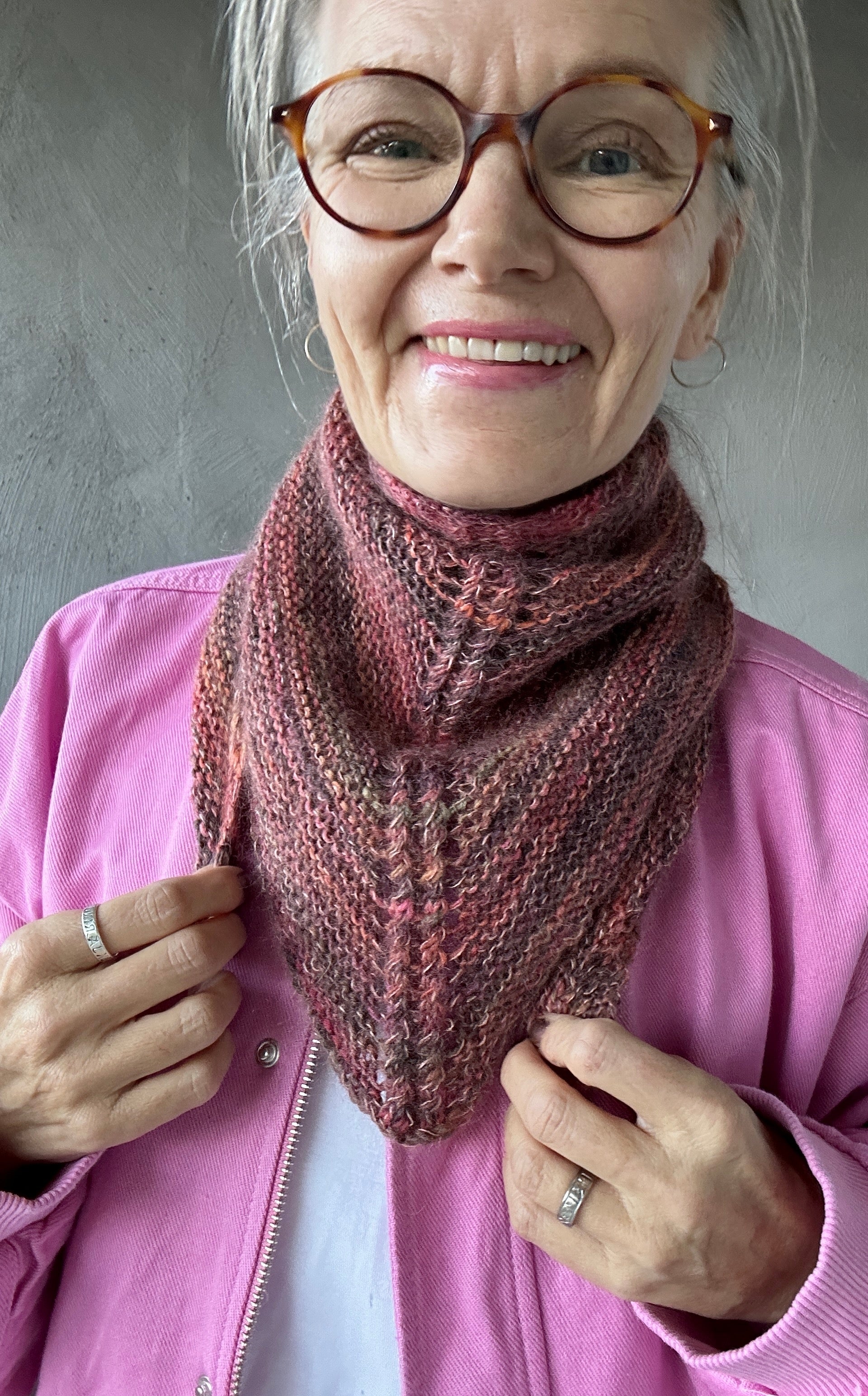 Petit VenneSkjerf er avbildet i fargene ITO Hana garn farge Autumn Leavs ogITO Sensai garn farge Cherry Blossom. ITO Hana garn farge Bark og ITO Sensai garn farge String