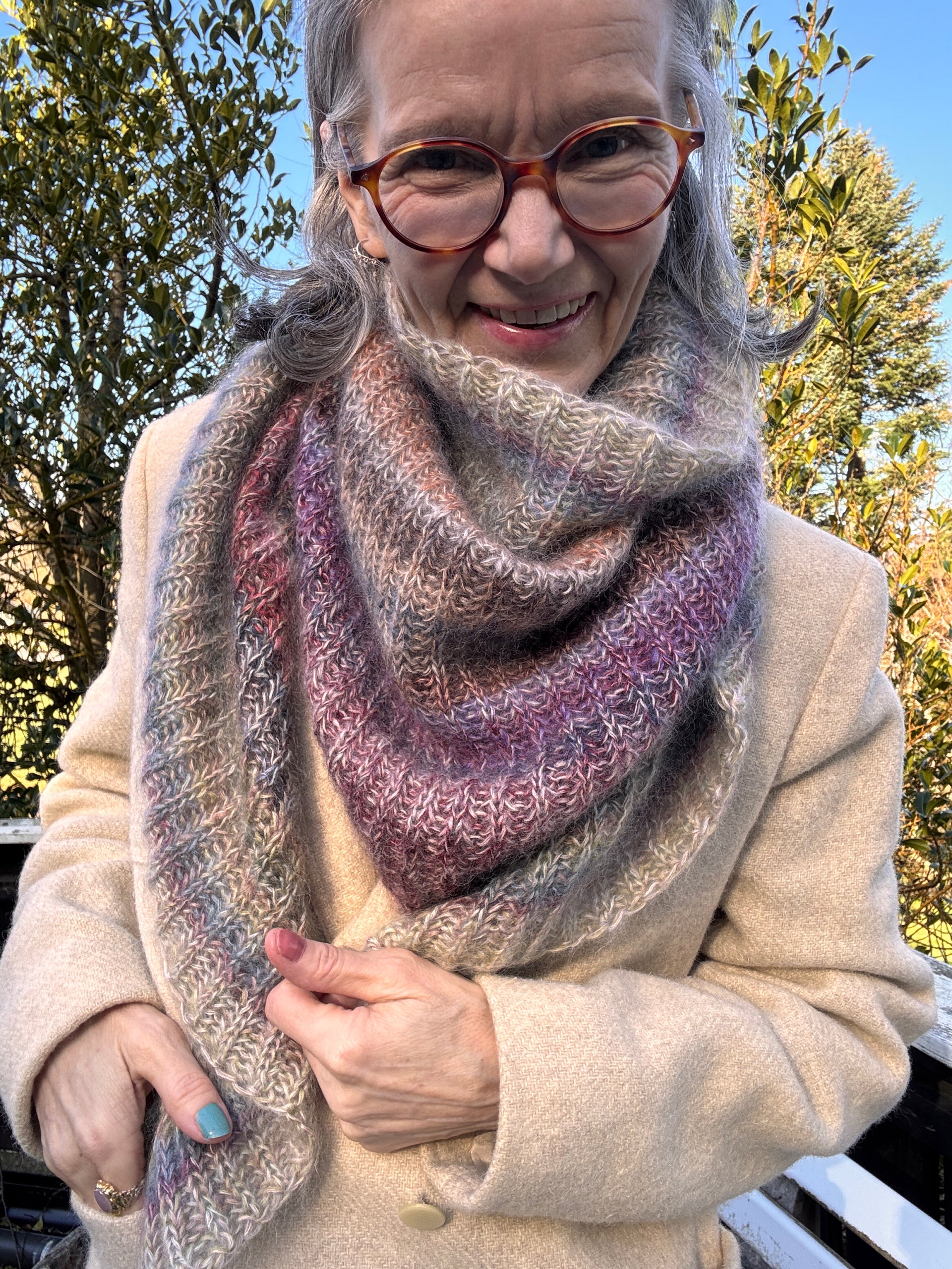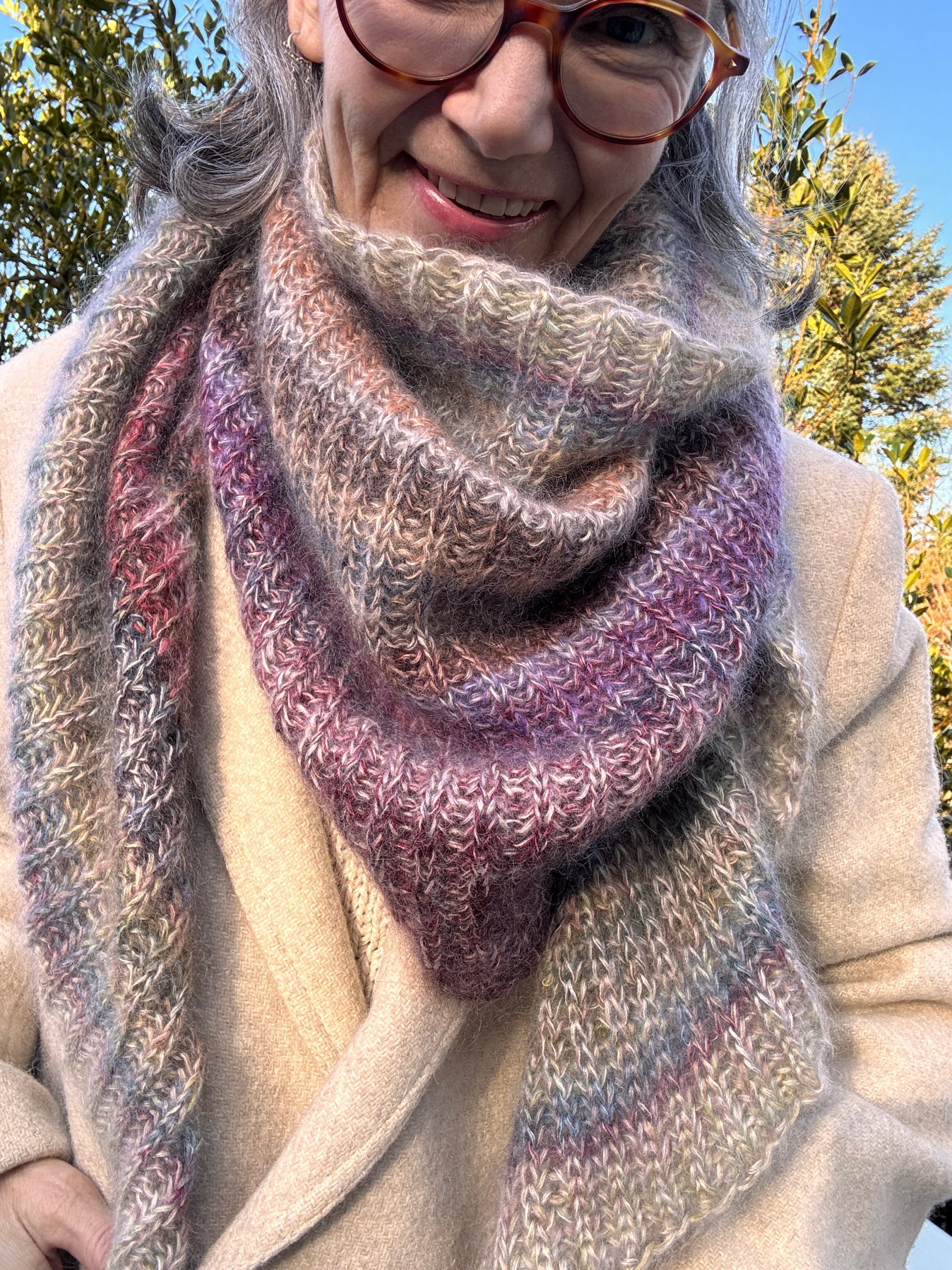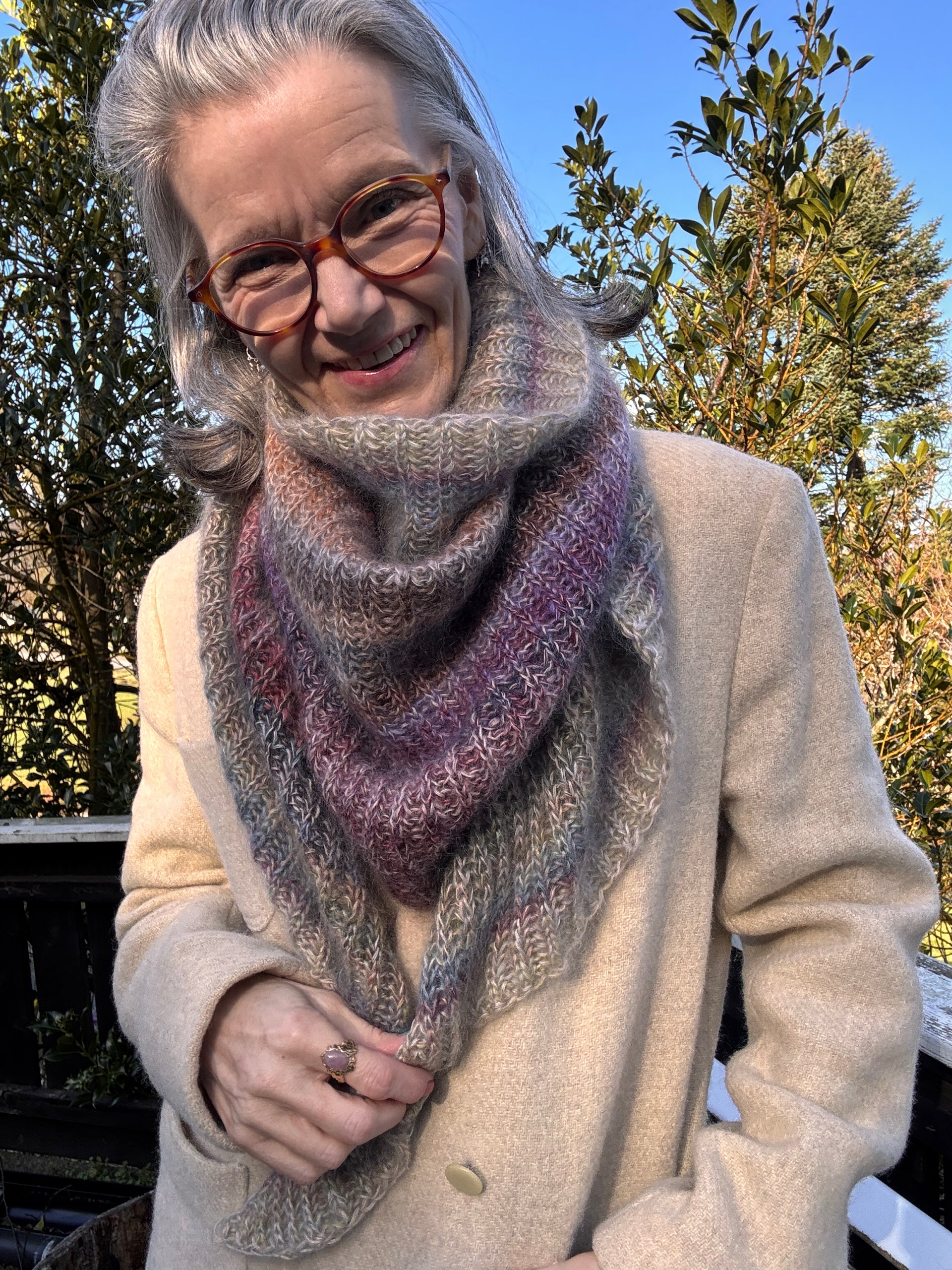 4 Strand Scarf strikkes frem og tilbake på rundpinne i patentstrikk med kast på pinnen. Da blir skjerfet og ekstra luftig. Du begynner med få antall masker og øker gradvis i sidene, slik at skjerfet formes til en stor trekant.