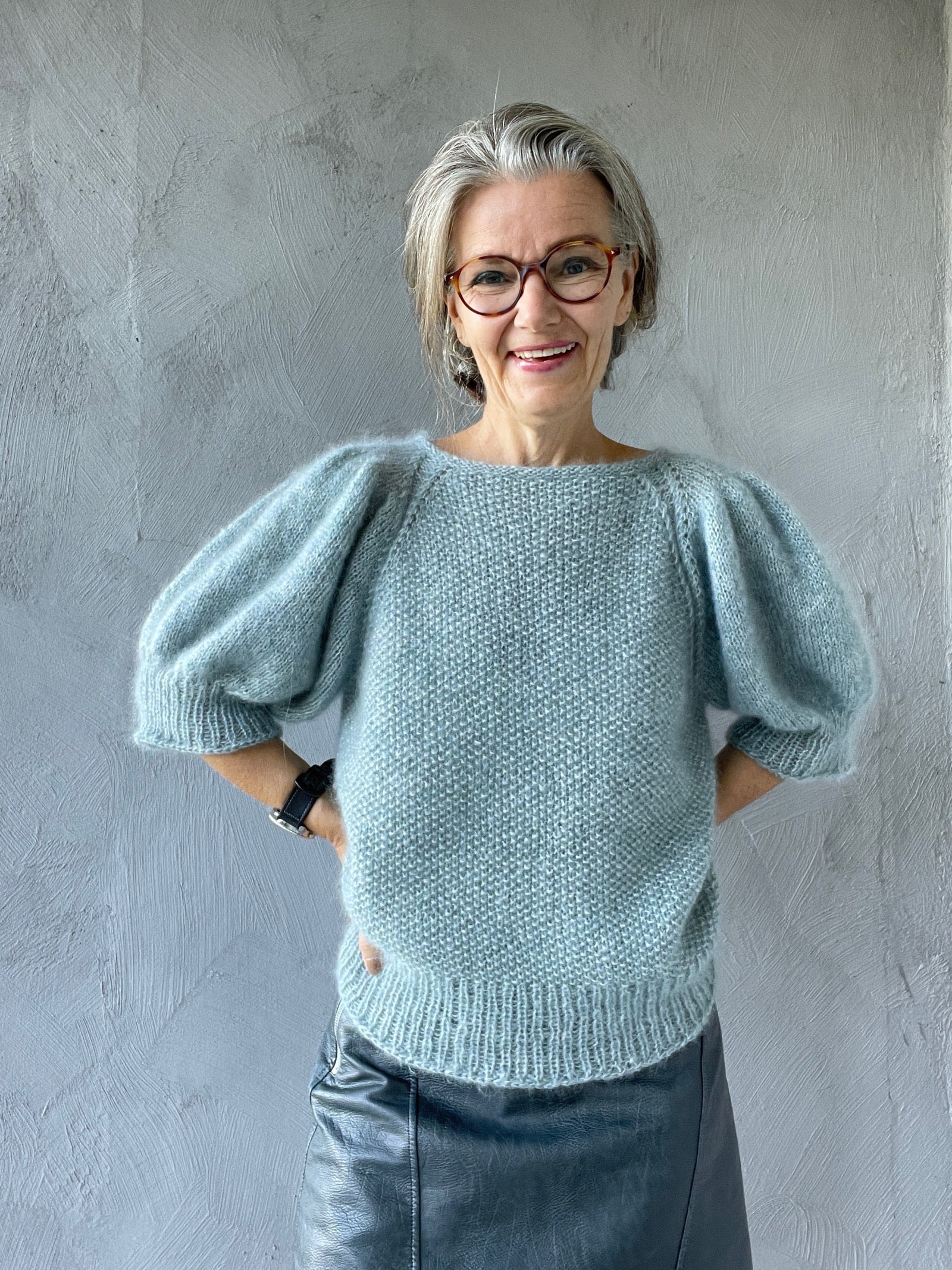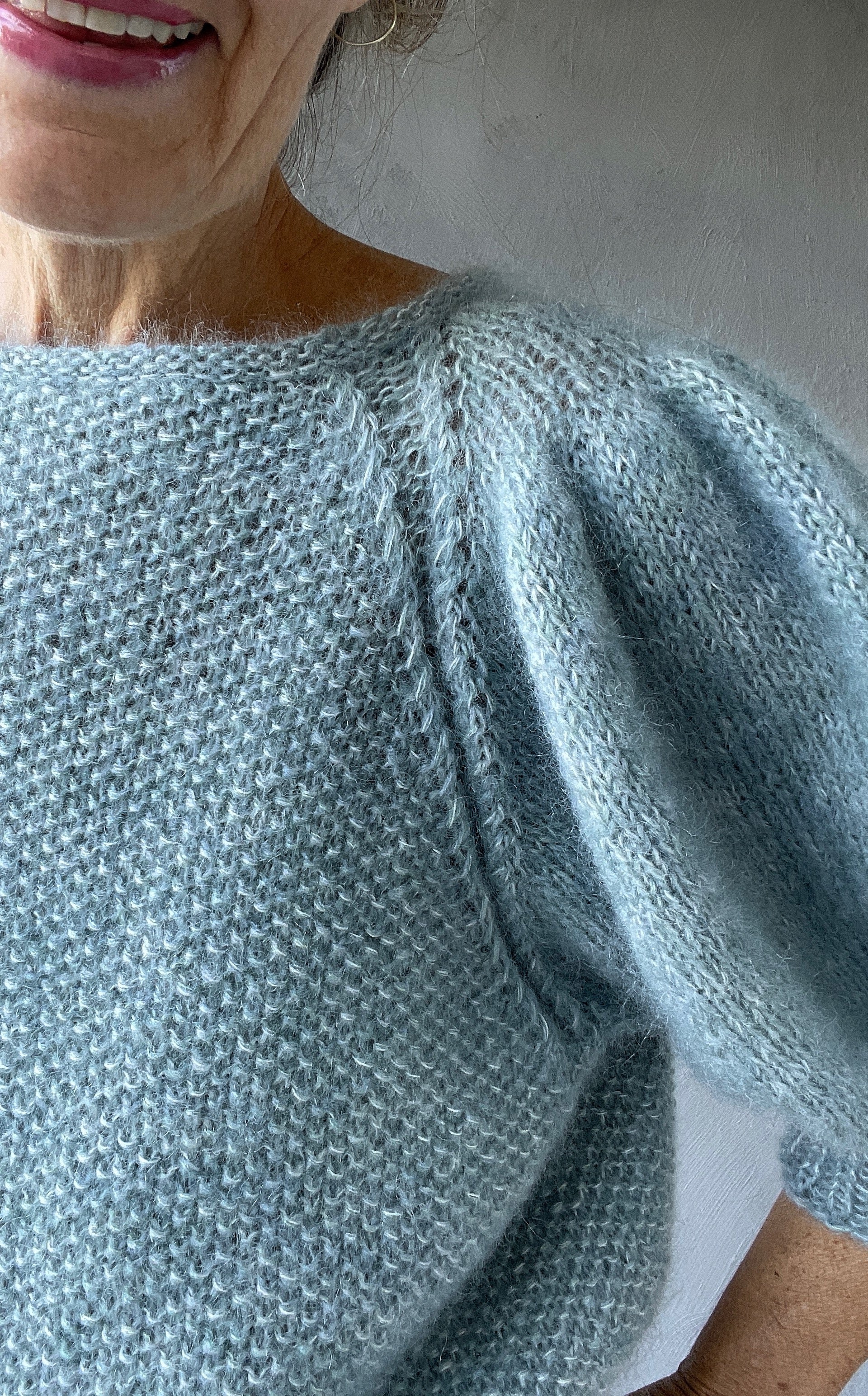 Der Pullover wird von oben nach unten auf einer Rundstricknadel gestrickt. Der gesamte Pullover wird aus 3 Fäden Silk Mohair Garn. Der Halsausschnitt wird glatt rechts gearbeitet, bevor er auf die Innenseite geklappt und dort angestrickt wird. Im Anschluss erfolgt ein Perlmuster auf Vorder- und Rückseite, während die Ärmel glatt rechts gestrickt werden mit einem kleinen, dezenten Zopfmuster an den Raglanschrägen.