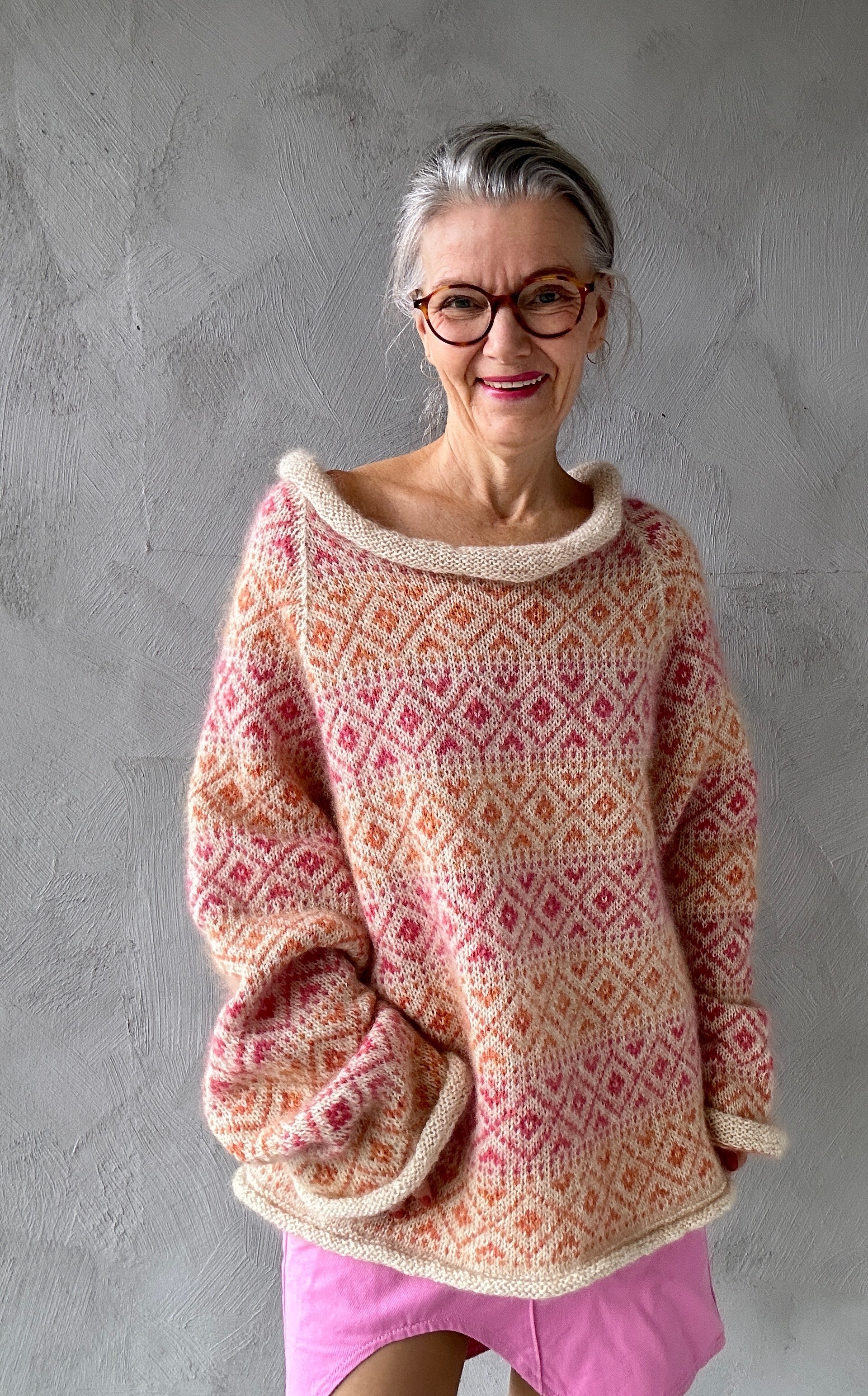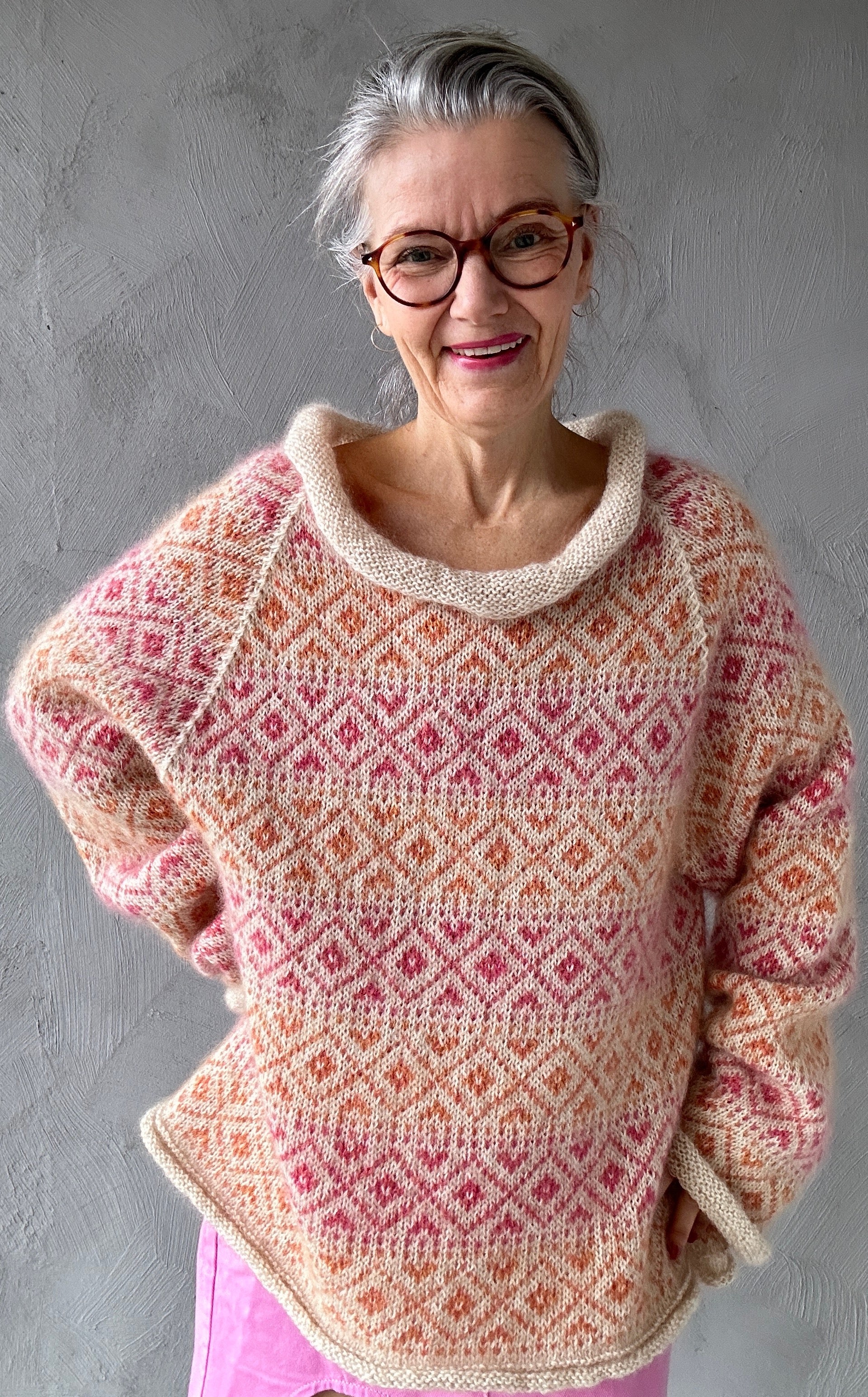 Der Pullover wird von unten nach oben auf einer Rundstricknadel gearbeitet. Zuerst erfolgt der Rumpf, im Anschluss beide Ärmel und zuletzt werden alle Teile auf einer Nadel platziert und die Passe wird mit Raglanabnahmen gestrickt. Die Ärmel wurden überlang entworfen und verleihen dem Pullover so eine ganz eigene Note. Der gesamte Pullover wird mit 2 Fäden gestrickt; 1 Faden Highland Wool und 1 Faden Silk Mohair. Sowohl Haupt- als auch Musterfarbe wird mit 1 Faden Highland Wool gefertigt. Beim Silk Mohair Garn gibt es für die Hauptfarbe 1 Farbe und für das Muster 2 Farben.