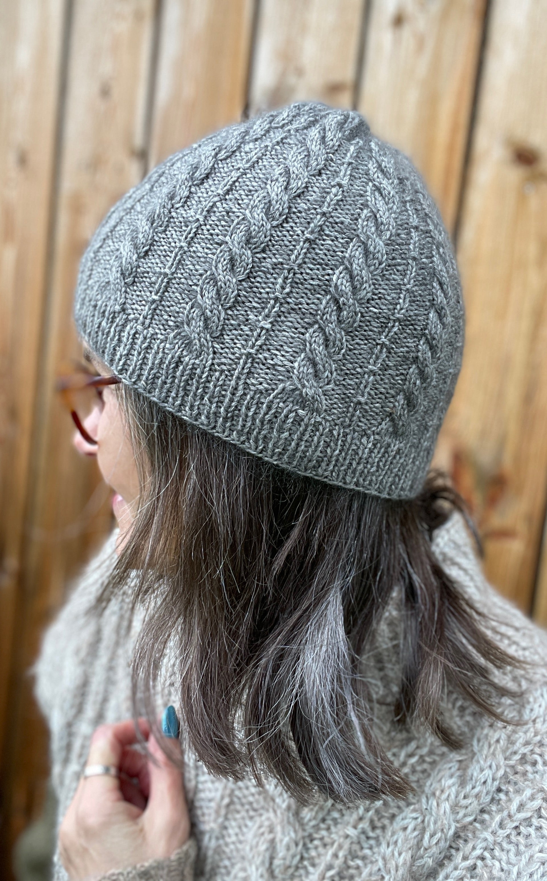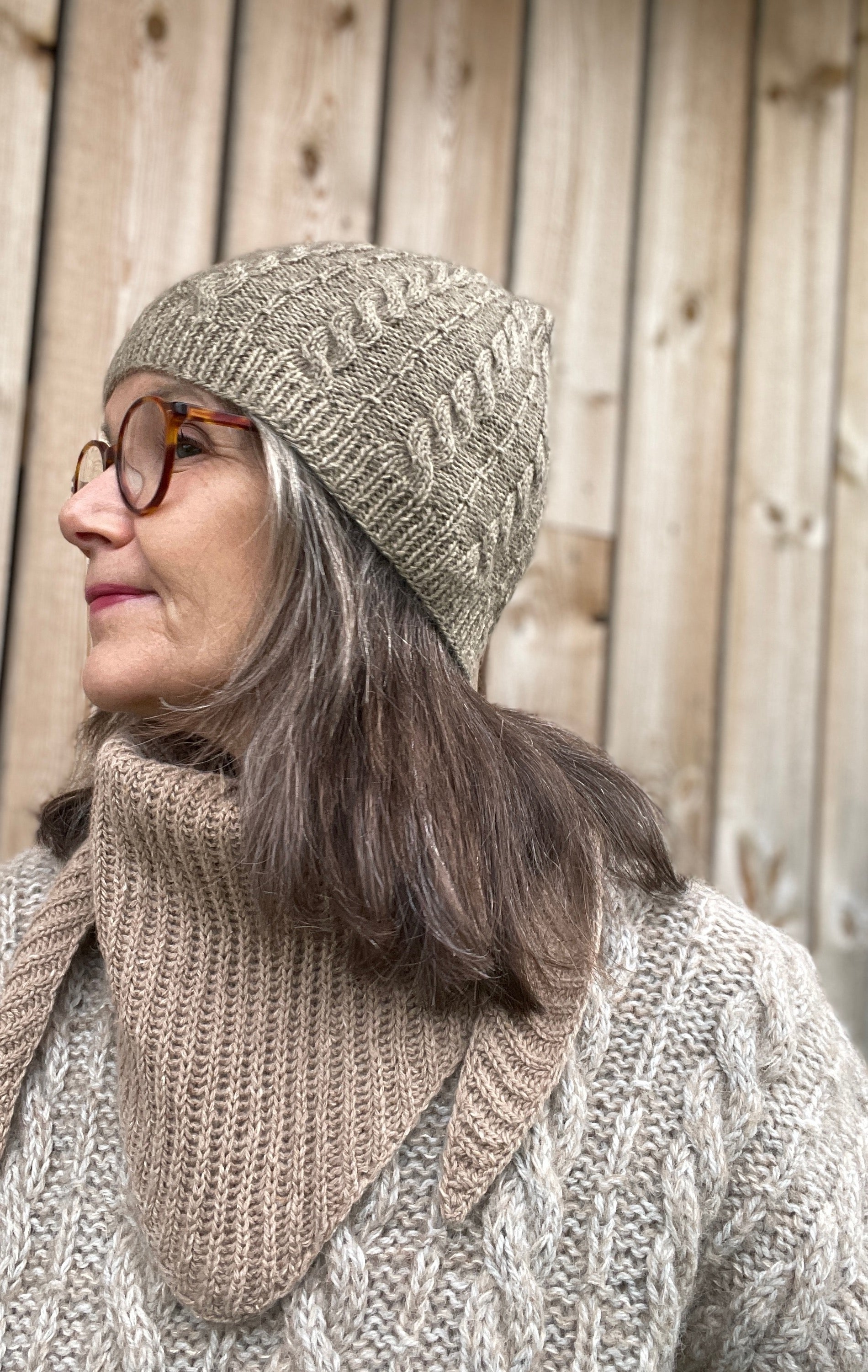 The beanie is worked with 2 threads on a circular needle. In this pattern I have used 1 thread ITO SHIMO and 1 thread ITO SENSAI. The cables are worked with a cable needle. This cable knit is same as in FletteVesten, FletteVest2 and FletteVest 3.0