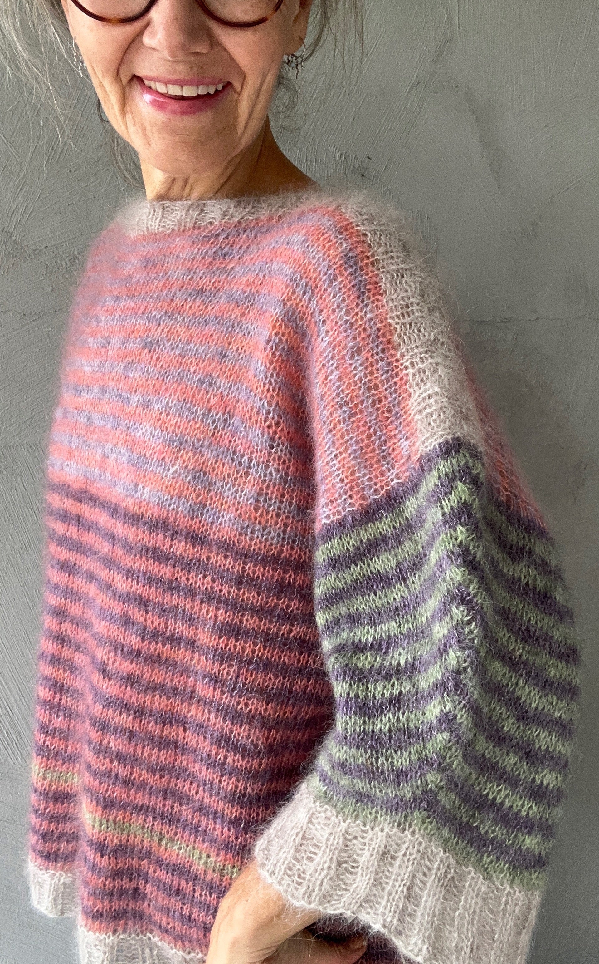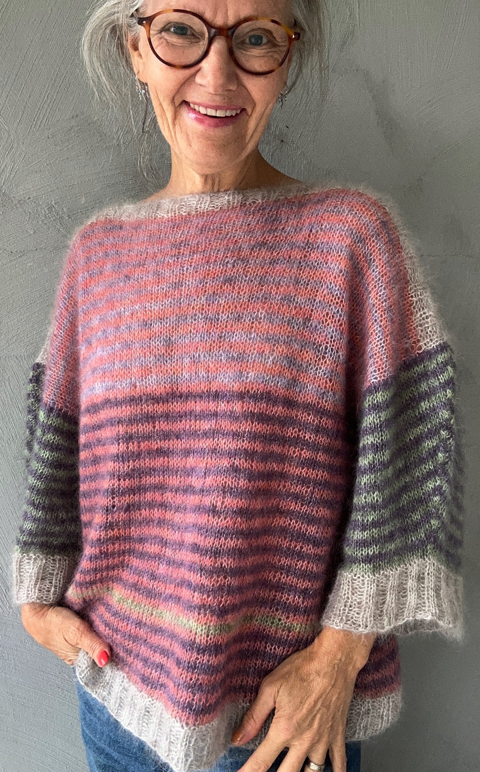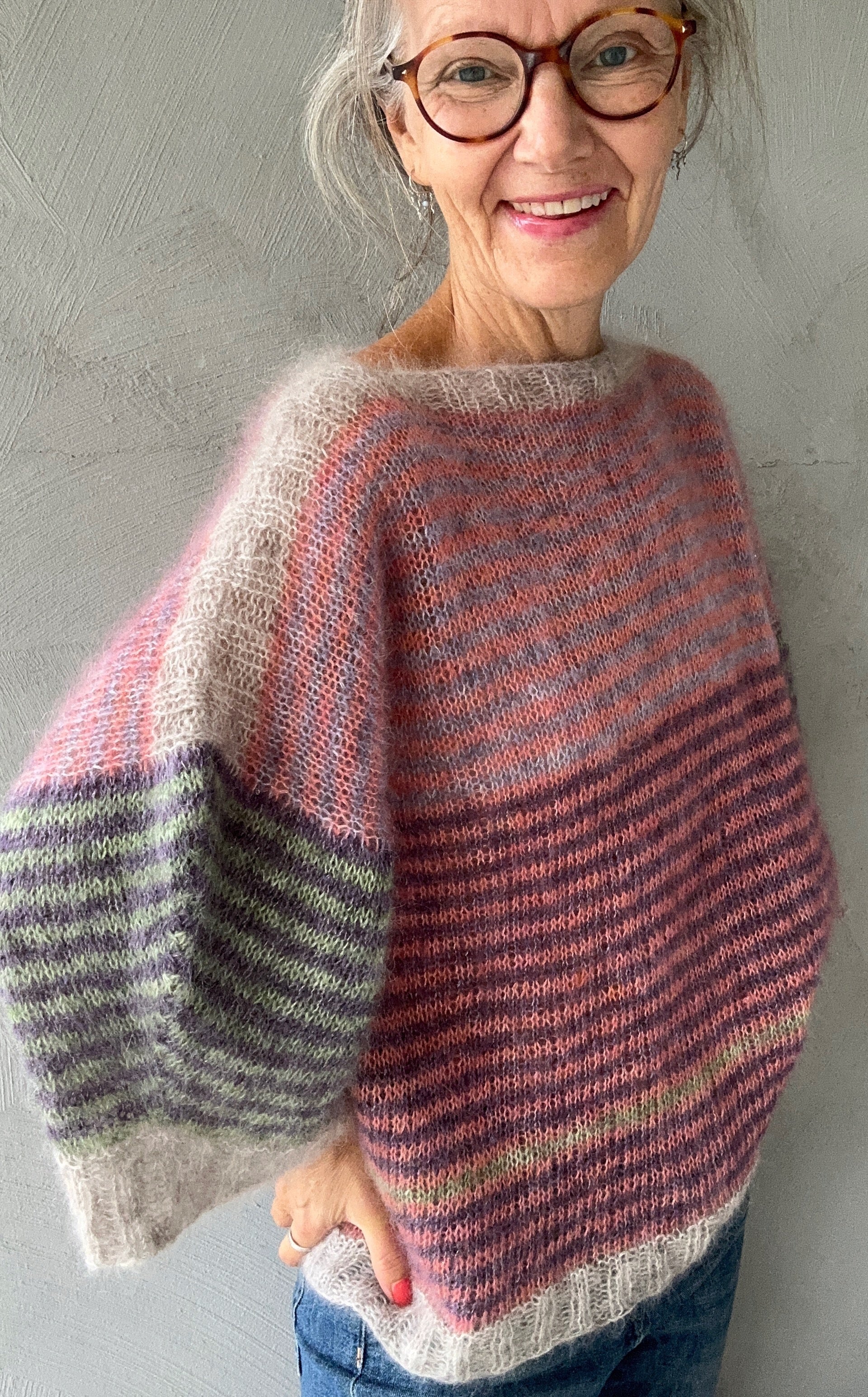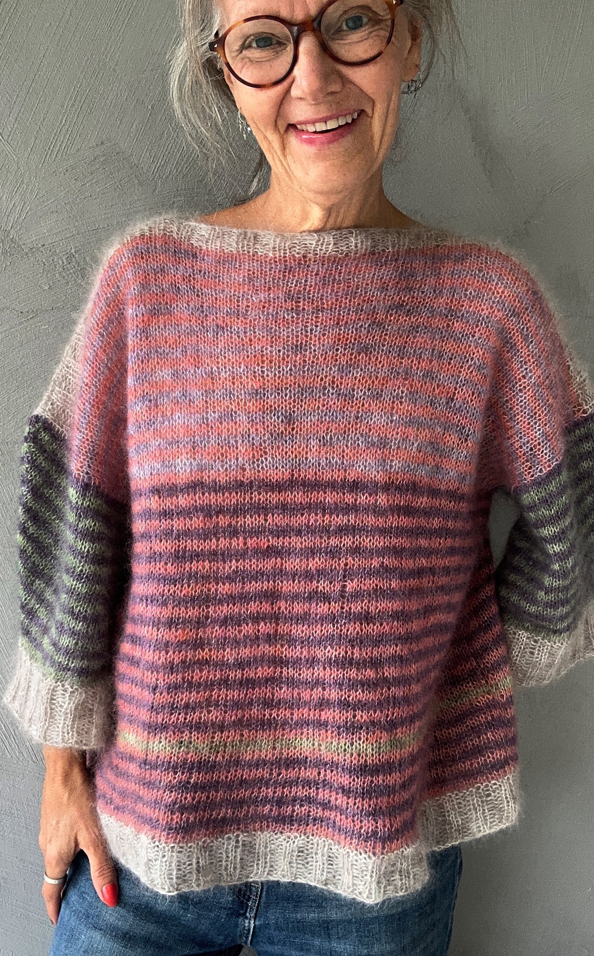 The body is worked in rounds on a circular needle, before it is divided into front and back piece at the armhole openings. Both pieces are finished separately flat in stockinette stitch i.e., knit on right side, purl on wrong side. In this pattern the sweater is worked in double thread Gepard Kid Seta Tweed. The sleeves are worked top down in stockinette stitch out of picked up stitches around the armhole openings. The sleeves are not in whole length.