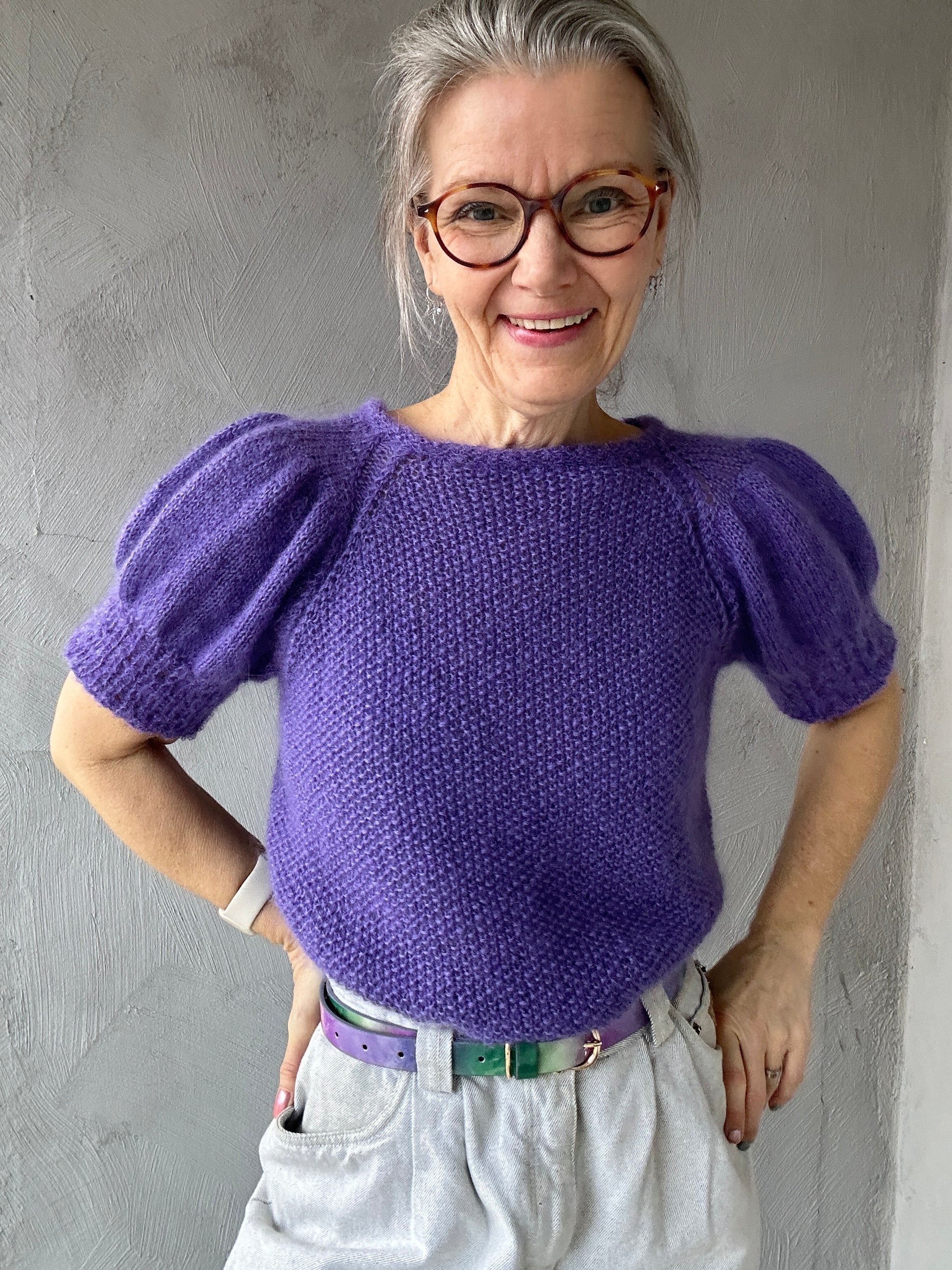 Moss stitch, puff sleevs and mini cable is perfect for LørdagsJumper. The top is fluffy, soft and light weight if you choose a Silk Mohair yarn. This is a top that can be used for most occasions. The jumper is worked top down on a circular needle. The yarn that is used in this pattern is 3 threads of ALVA by SOLBERG Spinderi , in 3 different Colors. ALVA yarn - 210 meters of each skein of 25 gram.