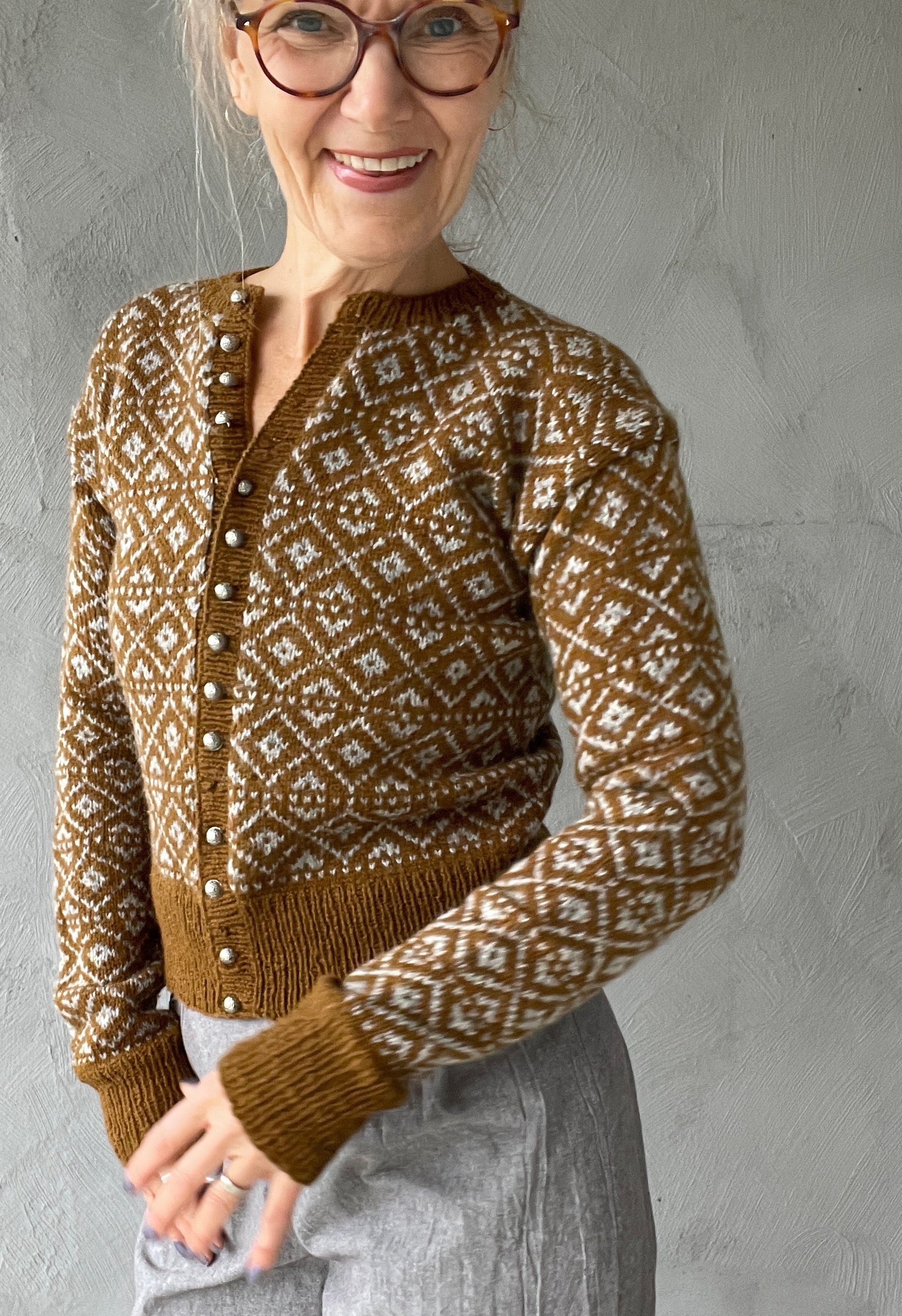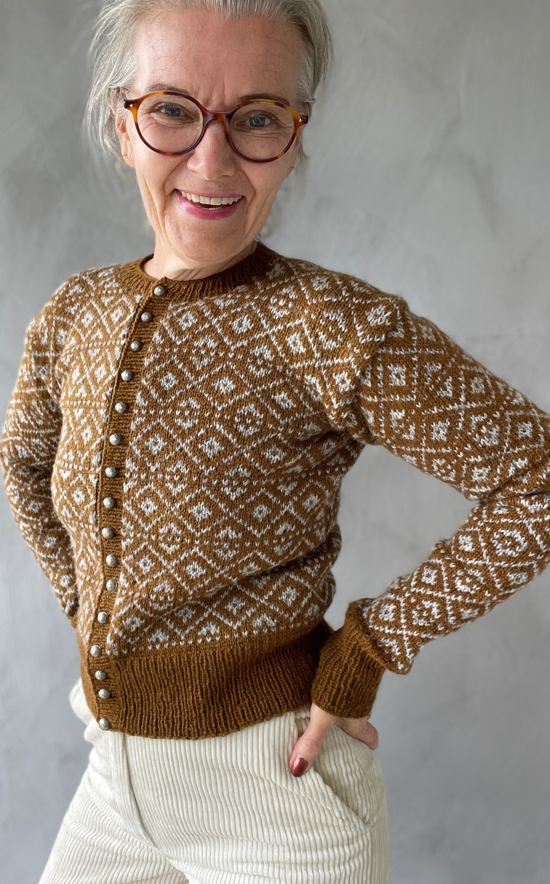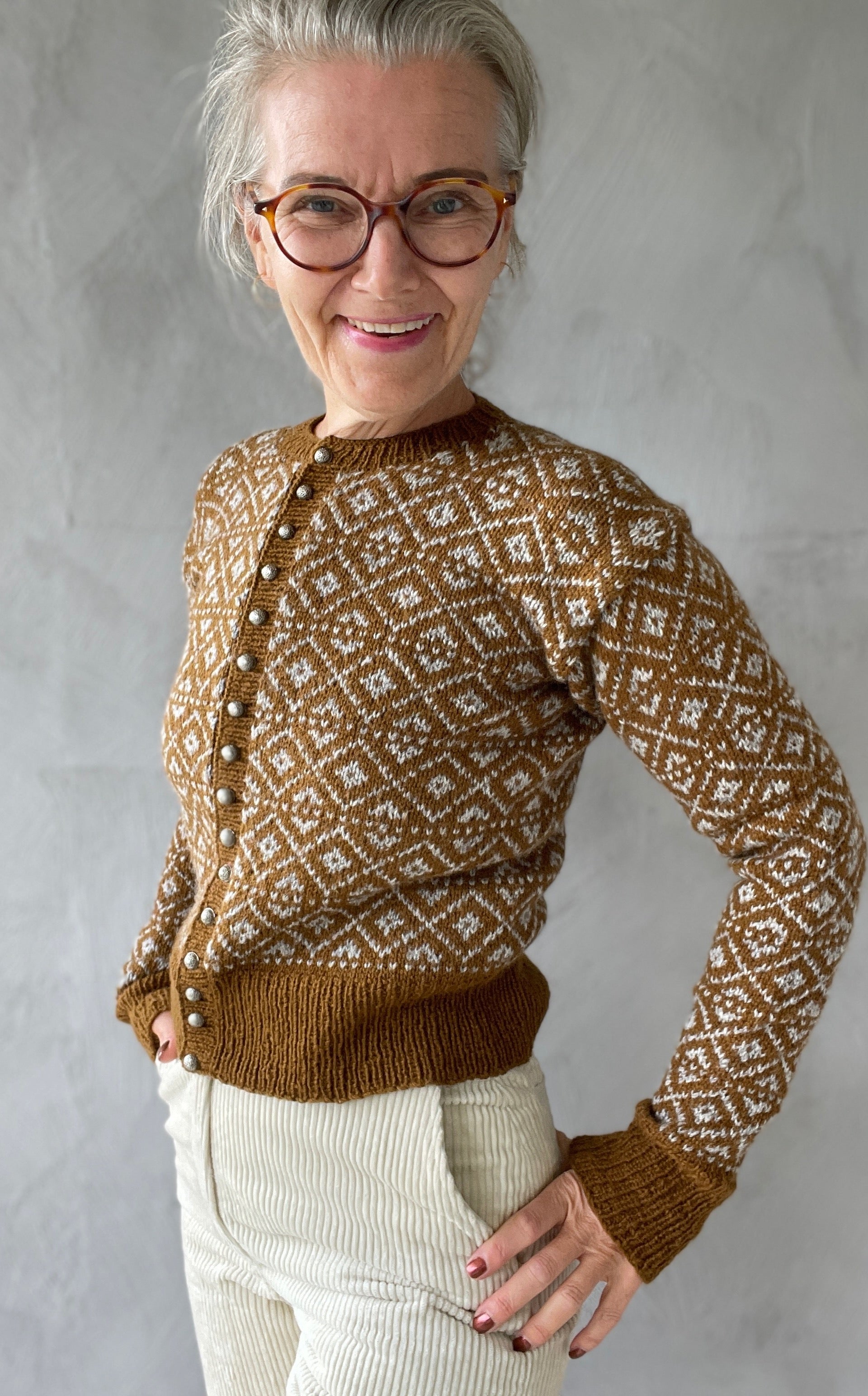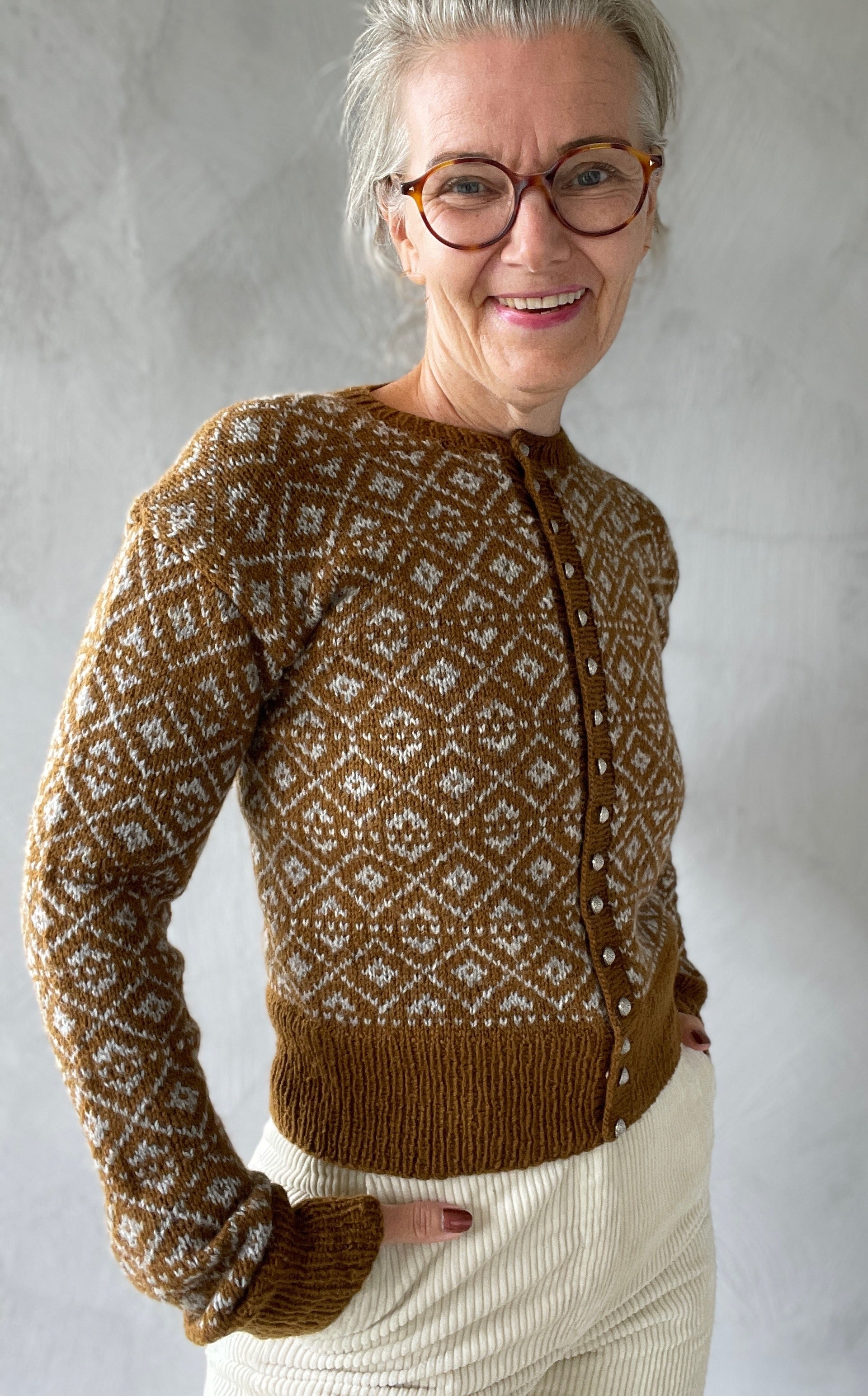 Fair ilse knit and wool yarn are a very good combination. OlaKofta is inspired by an old jacket / kofte that my father had back in the 1950s. This version has extra long sleeves and is a cropped model. Which is a good model for dresses, trousers or skirts with a high waist. The pattern is easy and fun to knit.