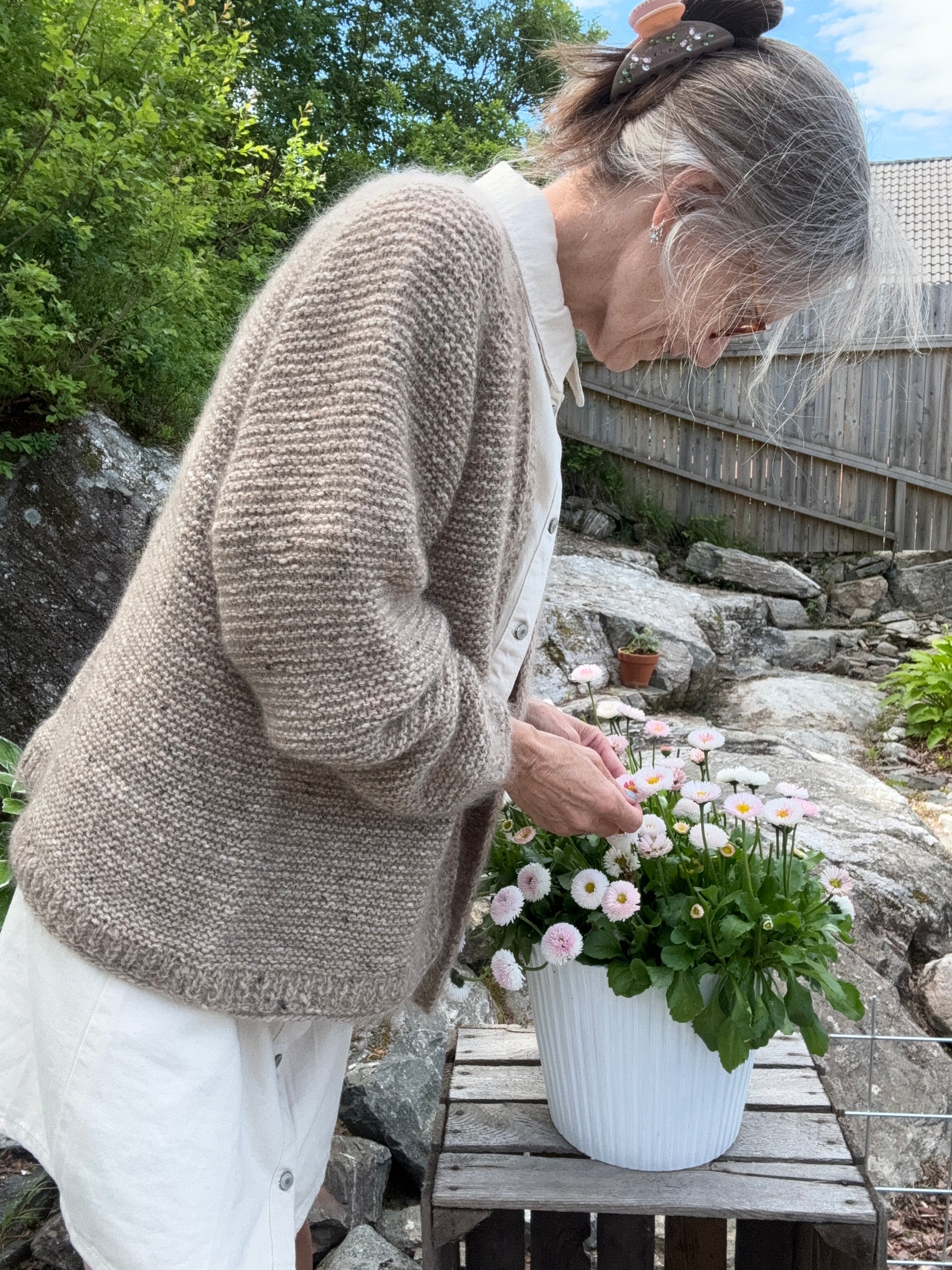 This jacket has been my favorite since I knitted it back in spring 2021. It´s knitted with garter stitch. The yarn that is used in the pattern is Finull (100% Norwegian wool. Yarn Weight Sport) fra RAUMA garn og Silk Mohair (75% kid mohair og 25% silke. Yarn Weight Lace) fra ISAGER garn.
