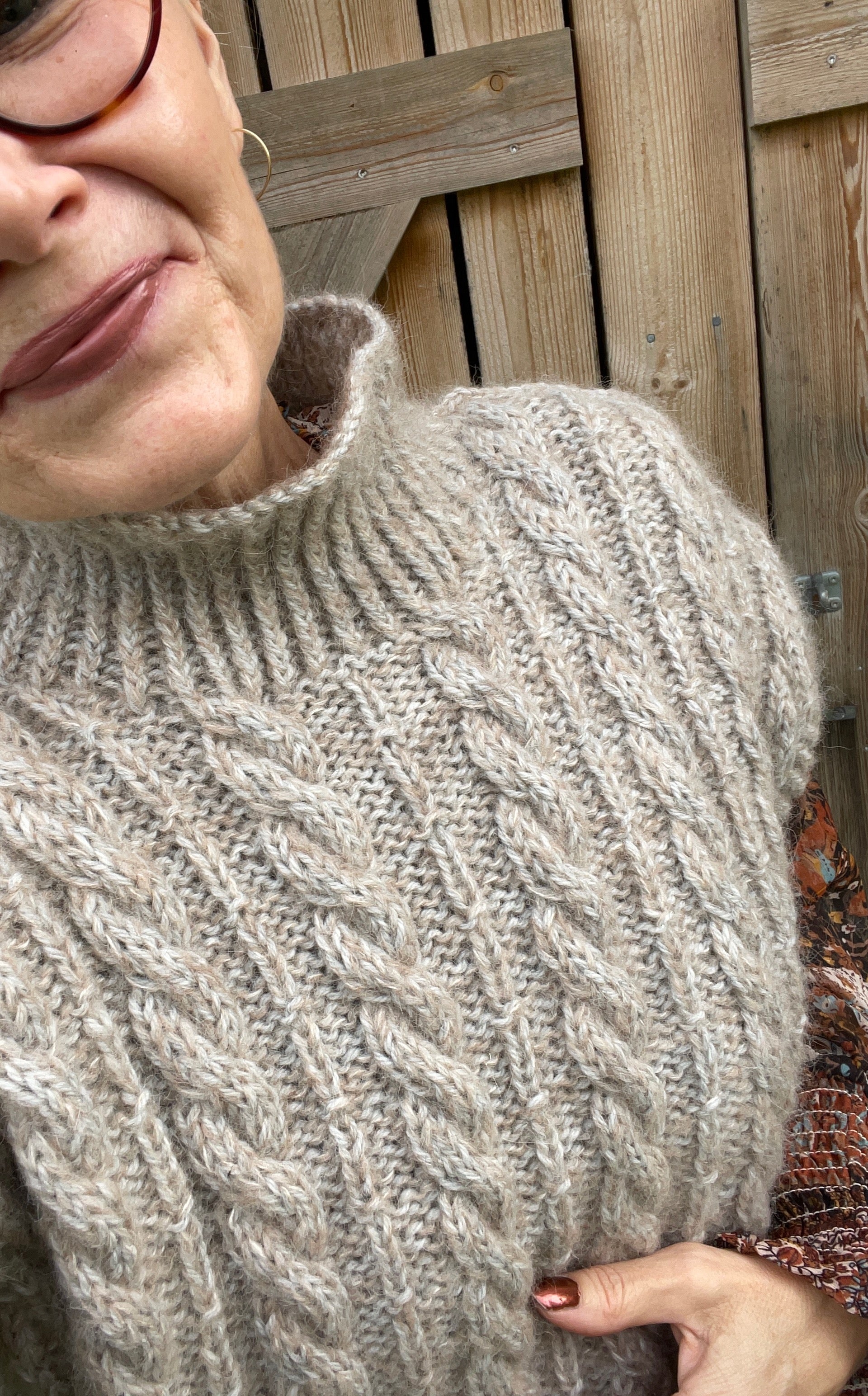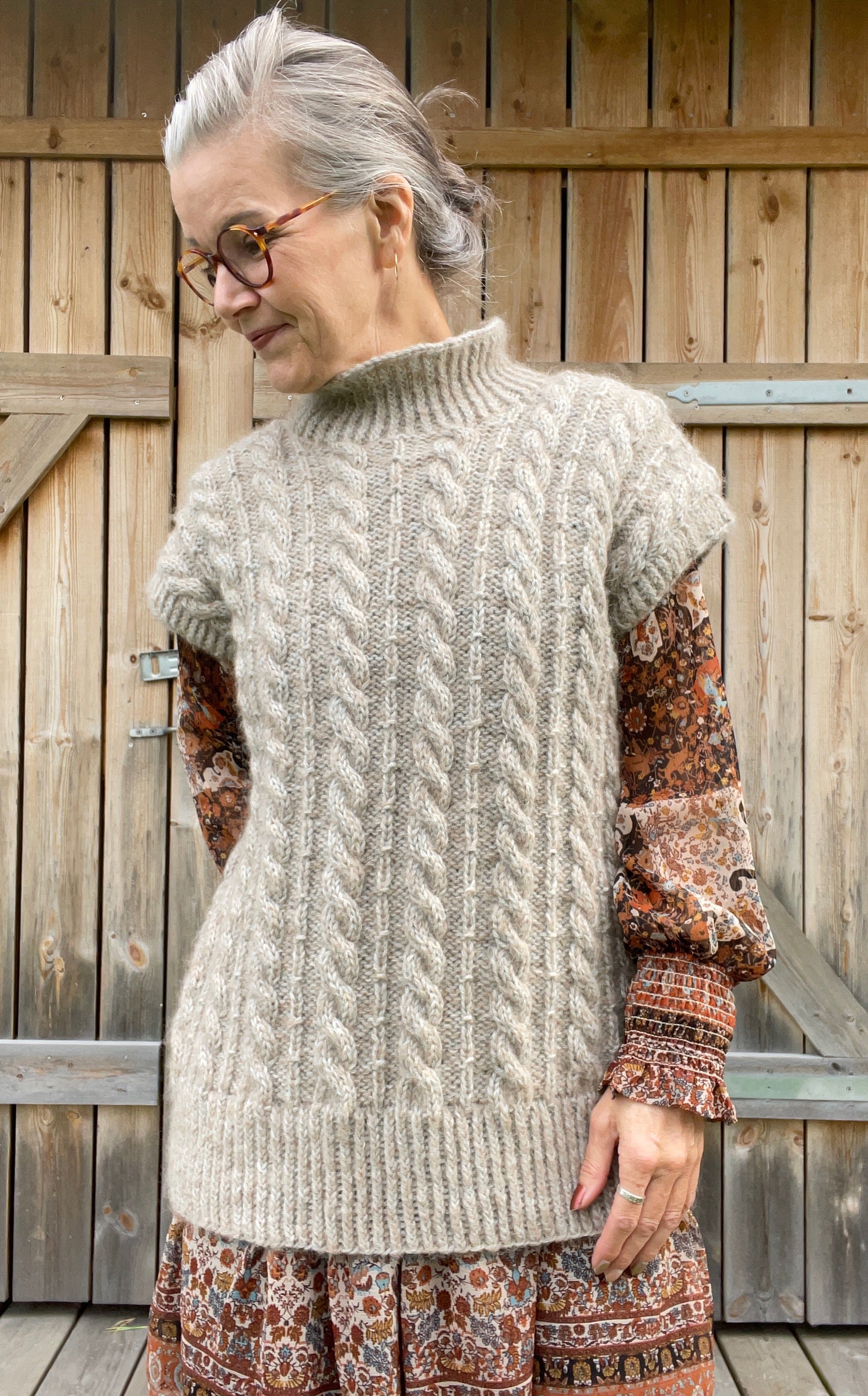 Die Arbeit wird in Runden auf einer Rundstricknadel gestrickt und wird an den Armausschnitten in Vorder- und Rückseite geteilt. Der abgebildete Zopf Pullunder in diesem Anleitung ist aus 1 Faden TUMI und 1 Faden Alpakka Lin von RAUMA garn gefertigt.