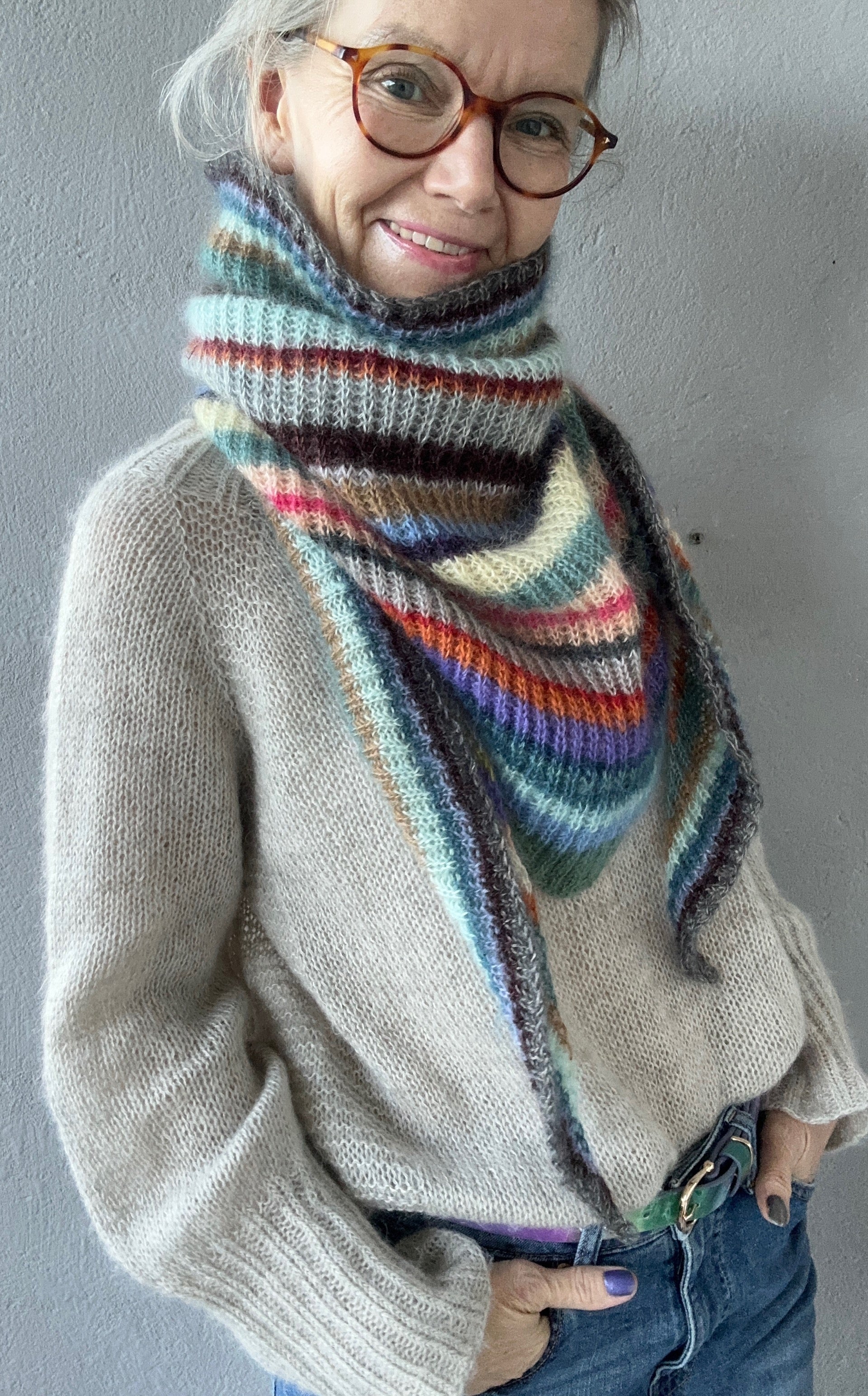 Fluffy Scarf is in color 98 LACE LANG Yarns. Last photo ITO SENSAI in different colors, in thin or bigger stripes. Feel free to use your fantasy to make your own colorful Fluffy Skjerf of your own leftover yarn.