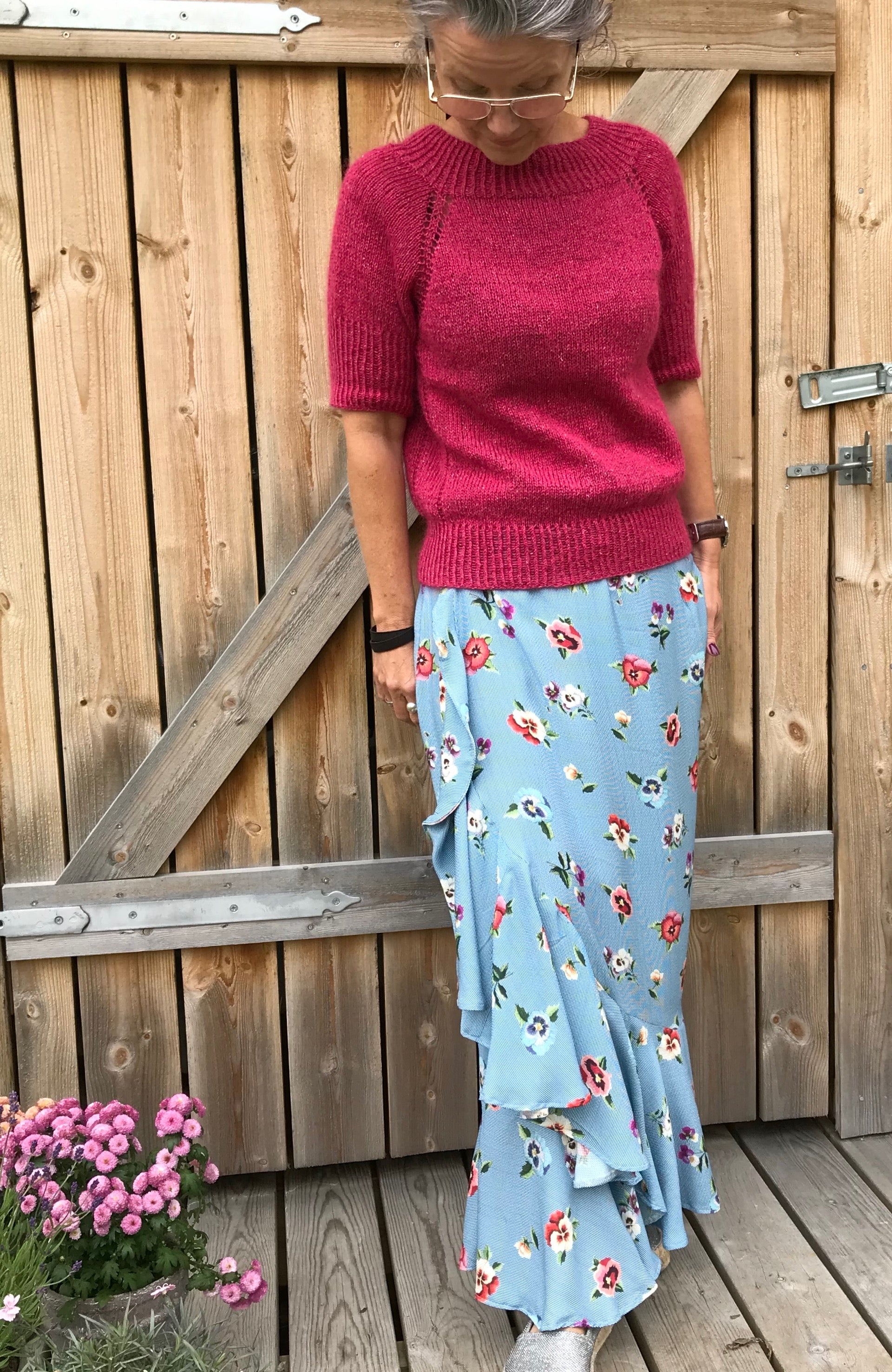 Tara Toppen stickas uppifrån och ned på rundsticka. Då kan du fin justera längden själv. Du stickar med dubbelt garn hele tiden en tråd ITO SENSAI och en tråd ITO KINU. Stickar du löst på resåren för halsen vill Tara Toppen glida ut på axlarna. När du har stickat neråt, kan du sätta över toppen på 2 långa rundstickor. Så ser du längden om den är som du önskar