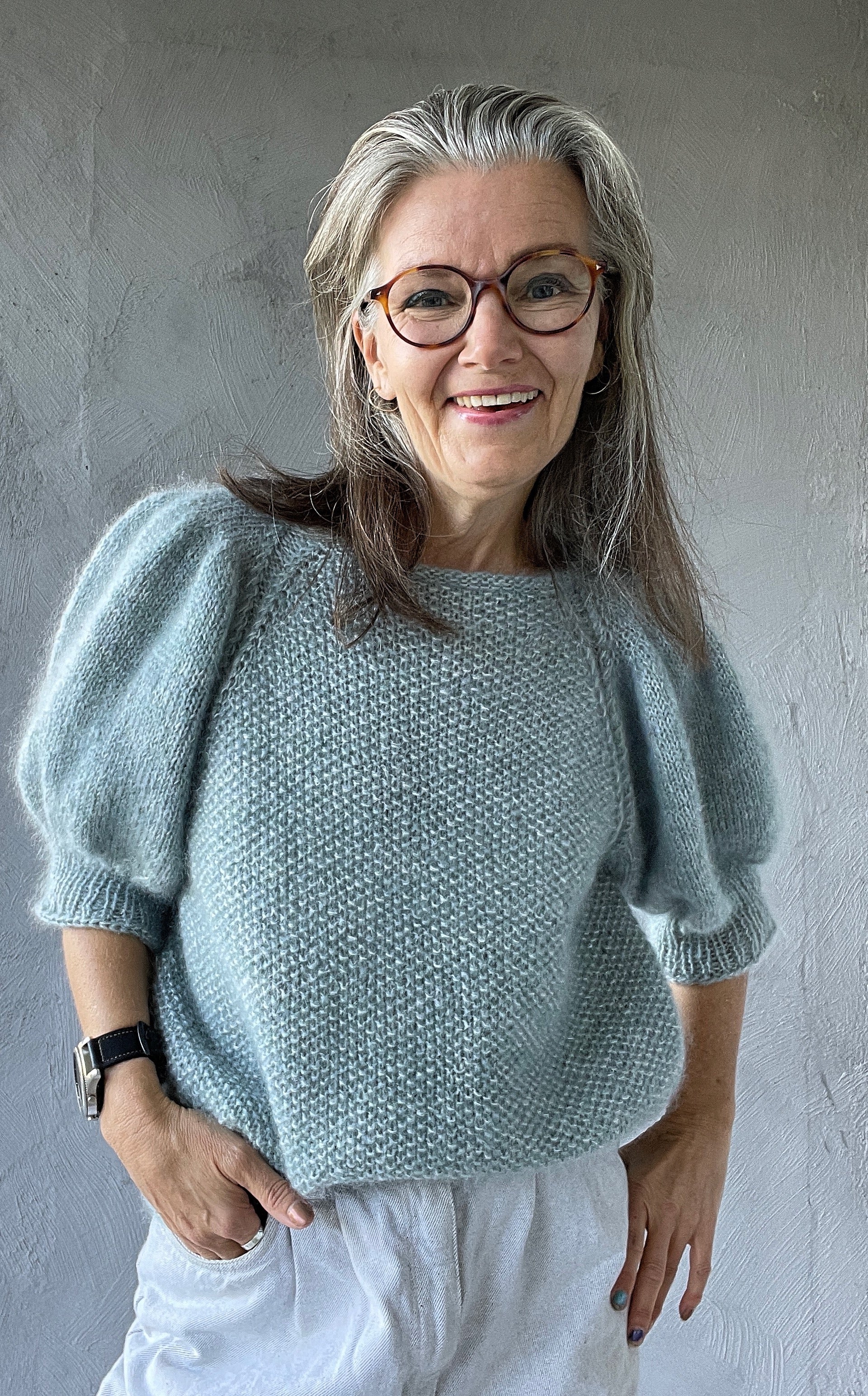 Vous travaillerez le pull en rond, de haut en bas. La laine utilisée pour ces instructions est la Silk Mohair de ISAGER Yarn. Le col se travaille en maille jersey on rond, puis il est plié et le premier et le dernier tours sont tricotés ensemble pour former un col double. Vous travaillerez le devant et le dos en point de riz, les manches en maille jersey et les mailles autour du raglan avec de petites torsades.