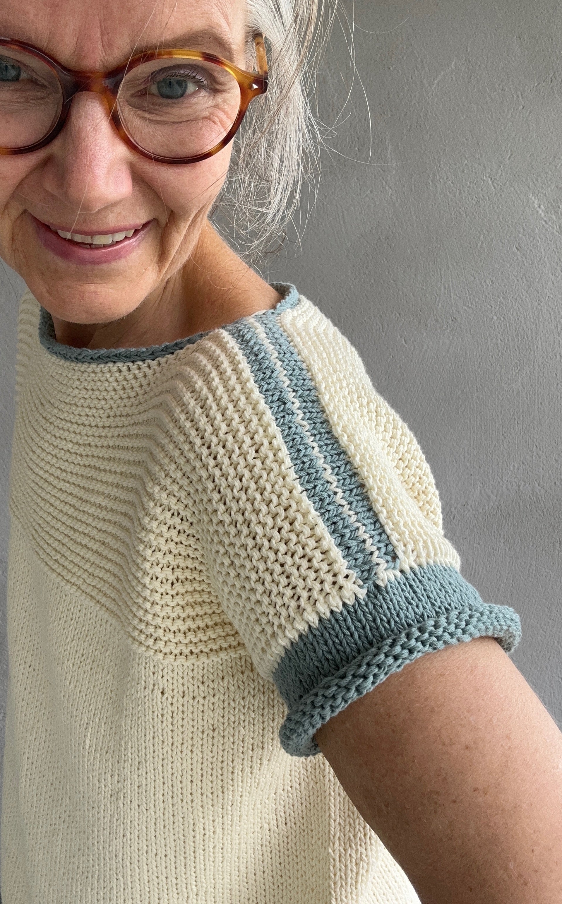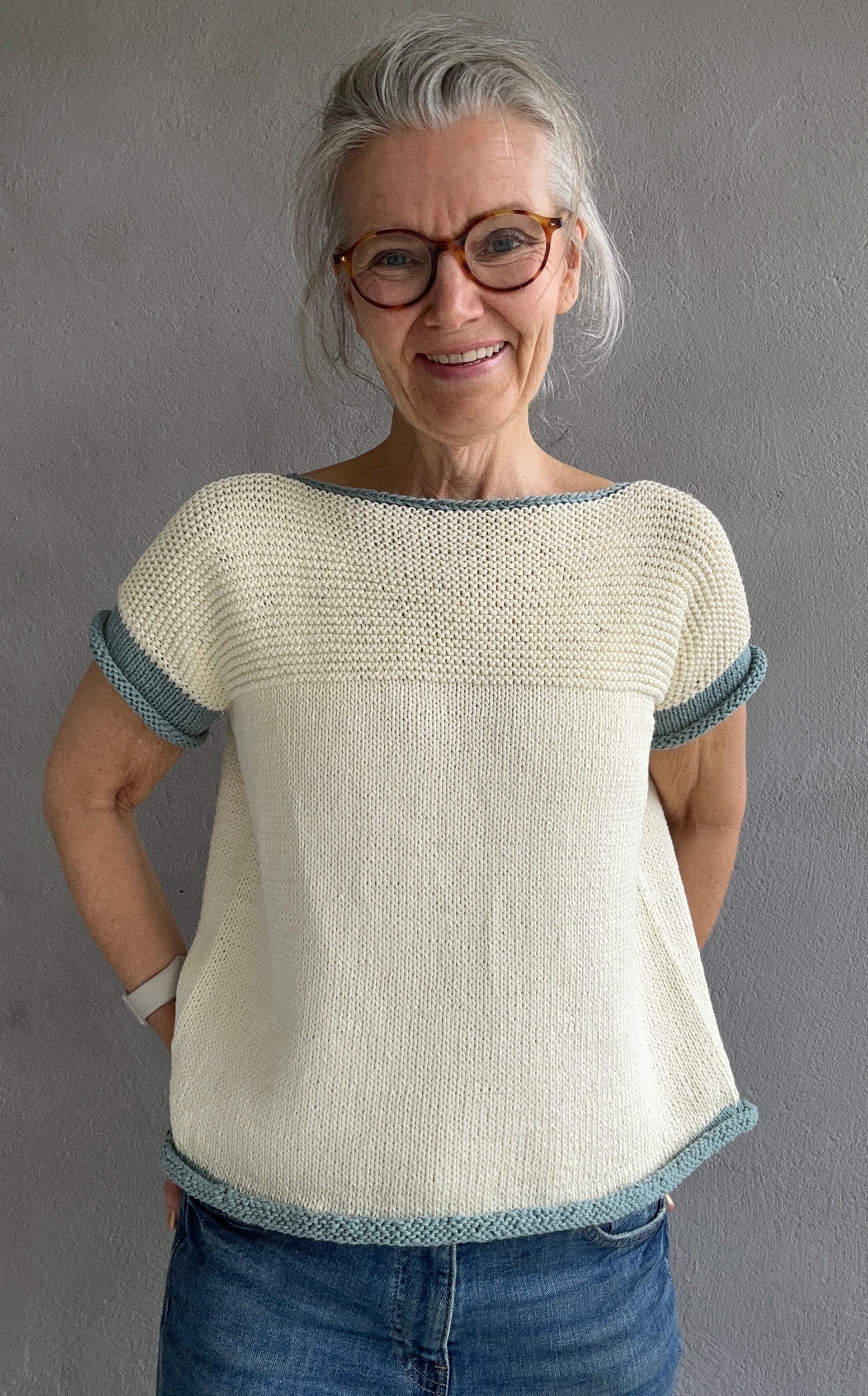 Garnalternativ: SANDNES Line (53% bomull, 33% viscose og 14% lin – 110 meter pr 50 gram) fra SANDNES GARN og Bomulin fra ISAGER Garn (65% bomull og 35% lin – 210 meter 50 gram). Enkel tråd SANDNES Line, og til rullekant og kort erme er det strikket med dobbel tråd ISAGER Bomulin. Du kan fint velge en kontrastfarge i SANDNES Line.